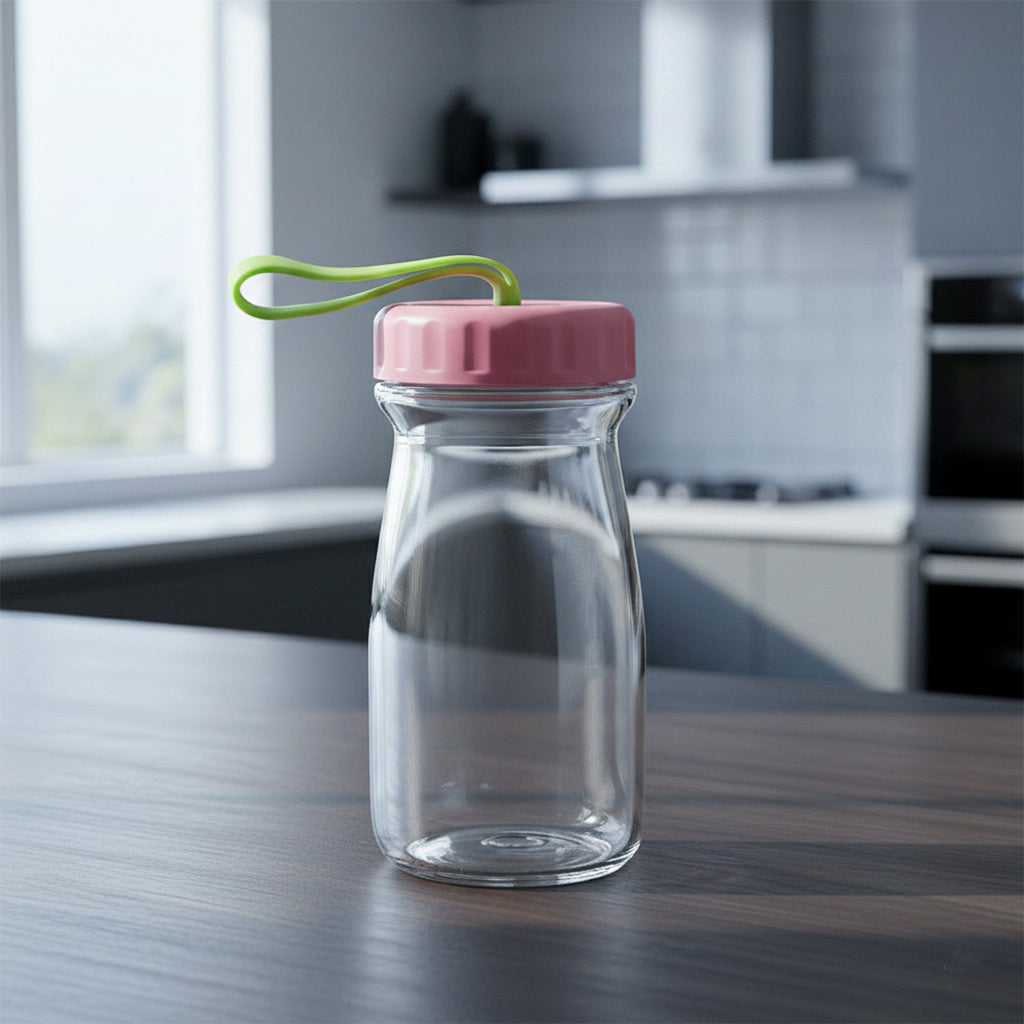 This Premium Glass Bottle offers a sleek and practical solution for storing milk, juice, water, and other beverages. Made from high-quality, food-grade glass, it ensures safe and hygienic storage while maintaining the freshness of your drinks. The bottle is designed with a secure, leak-proof lid and a vibrant silicone cap that makes it easy to carry with the built-in handle. With a 300 ML capacity, it is perfect for single servings of milk, juice, or other beverages. Its transparent design allows easy visibility of contents, making it both functional and stylish for your kitchen, office, or on-the-go needs.