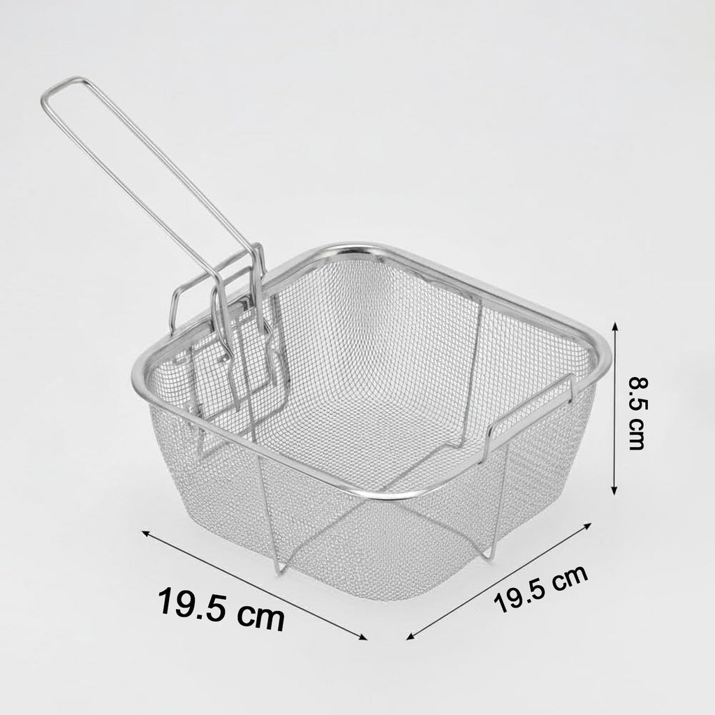 This stainless steel deep fryer basket is designed to make frying and draining food safer, cleaner, and more efficient. The fine mesh structure allows excess oil to drain quickly while securely holding food items during frying. Its square basket design provides ample space for frying snacks evenly, while the long handle helps keep hands at a safe distance from hot oil. Suitable for regular home kitchens as well as professional food preparation environments, this basket supports smooth handling and consistent frying results. Easy to clean and store, it is a practical addition to everyday cooking tools.