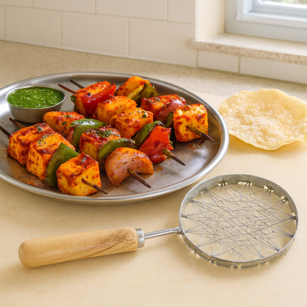 The sturdy metal frame combined with a strong wooden handle provides a comfortable grip and better control during cooking. Ideal for handling snacks, paneer, fritters, fried vegetables, or grilled items, this skimmer is a practical tool for everyday Indian cooking. Its durable construction makes it suitable for regular kitchen use while maintaining hygiene and safety.
