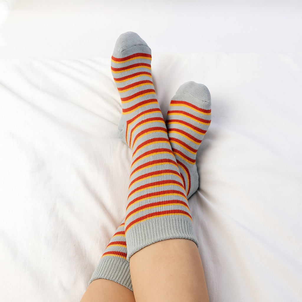 These stylish crew socks feature a soft base highlighted with creating a cheerful and modern look suitable for all ages. The knitted fabric offers a smooth and breathable feel, ensuring comfort throughout long hours of wear. Designed to maintain shape and flexibility, the socks provide a secure fit without causing irritation. Their fun striped design makes them perfect for pairing with casual outfits, lounging at home, or everyday outdoor use. Whether used during warm or cool seasons, these socks add a touch of playful energy to your daily wardrobe.